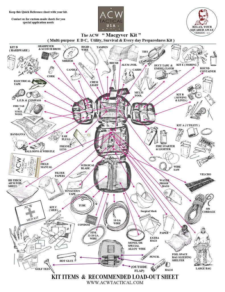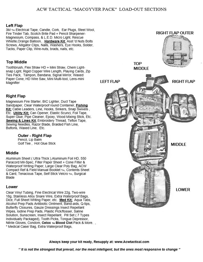 A Survival & Possibilities kit for any scenario. Designed and curated to add options for the problem solver! Over 175 key multi-purpose items gives you the power to solve more dilemmas than any other single resource. Wilderness, Urban, Adventure,Travel, Utility, Emergency, Students and more. This small pack has your back. Includes our Every-day Tiny Survival guide showing so much to even list, including items usage tips. Perfect stand-alone, or as a core kit for your preparedness builds.