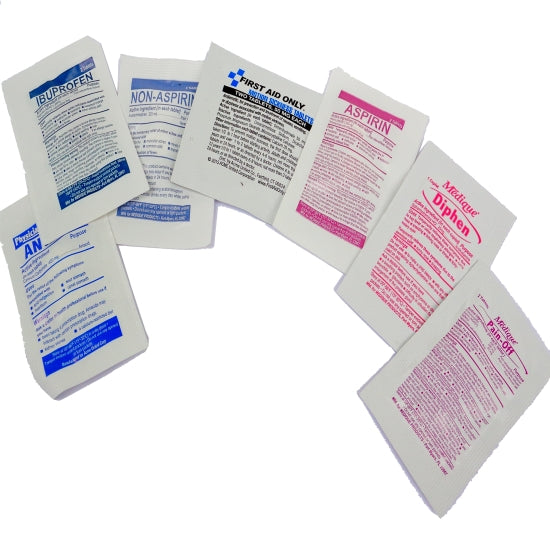 1 Aspirin double pack, 1 Non-Aspirin double pack, 1 Advil / Ibuprofen double pack, 1 Ant-Acid double pack, 1 extra strength pain reliever ( Excedrin equivalent) double pack, 1 Motion sickness pills double pack, 1 Diphenhydromine ( antihistamine ) single