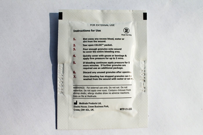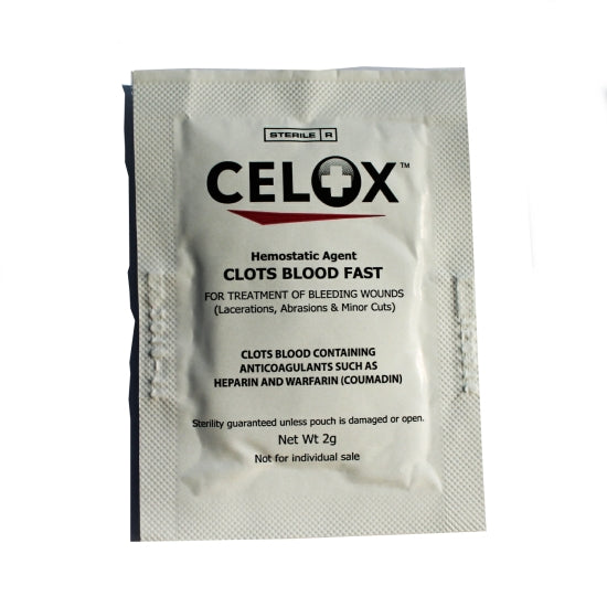 CELOX™ is a new granular hemostatic agent that controls life-threatening bleeding fast. It's safe for both the victim and the caregiver, simple to use - no training required - and can be used for bleeding injuries in extreme low temperatures and will even clot Heparinized blood. Best of all, CELOX can be used as an immediate response for all bleeding - even high pressure, high volume bleeding from major arteries - which saves time, eliminates decision-making and reduces blood loss.