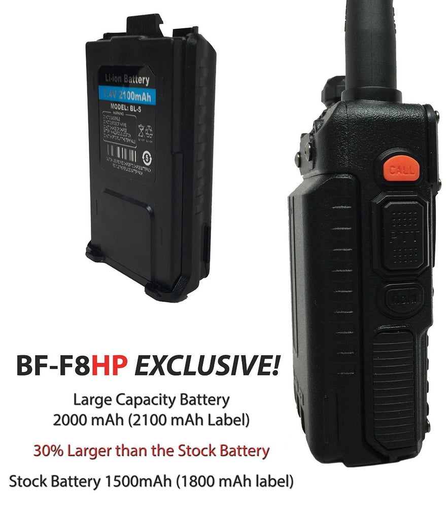 Upgrades from our Previous Generation UV-5R: Twice the Output Power (8 watts up from 4 watts output), New Hardened Durable Radio Shell, 30% Larger Battery, V-85 High Gain Antenna (Twice the Antenna Performance), USA Support + In-depth User Guide IncludedHigh / Med / Low Power Settings (8W, 4W, 1W); Frequency Range: 65-108 MHz(Only commercial FM radio reception) VHF: 136-174 MHz(Rx/Tx). UHF: 400-520 MHz(Rx/Tx); Broad (Wide) / Narrowband (Narrow) Selectable